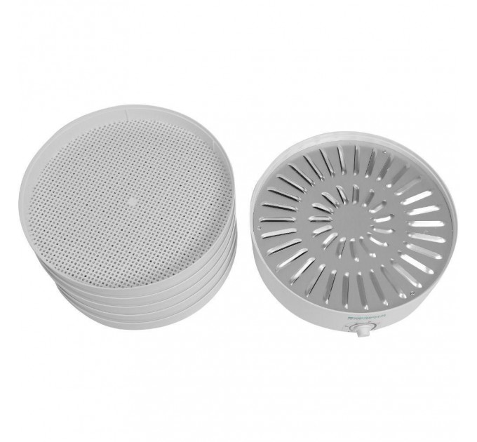 Вместительность. В сушилке предусмотрено 5-ть отдельных ярусов диаметром 38 см. В каждый из них можно поместить до 4 кг разных продуктов. Время сушки колеблется от 2 до 22 часов.